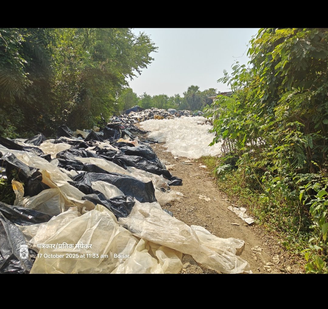 बोईसर| पालघर तालुक्यातील कोलवडे ग्रामपंचायत हद्दीत आज पर्यावरणाचा श्वास गुदमरला आहे. गावाच्या सीमेवर एमआयडीसीची जमीन असली, तरी त्या जमिनीवर प्रशासनाचा कसला ताबा राहिला नाही. त्या जागेवर रमाकांत आणि सदाम नावाचे दोन व्यक्ती उघडपणे बेकायदेशीर प्लास्टिक साठवण आणि धुलाईचा व्यवसाय चालवतात, आणि सगळं गाव त्या प्रदूषणाचा दंड भोगतंय. हजारो टन केमिकलयुक्त प्लास्टिकच्या पिशव्या या जागेवर साठवून ठेवल्या जातात. पिशव्या धुतल्या जातात ते नाल्यातील आणि बोरिंगच्या पाण्याने. आणि हेच विषारी पाणी पुन्हा निसर्गात मिसळवलं जातं. त्यामुळे हवा, पाणी, जमीन आणि जनावरं — सगळं काही हळूहळू विषारी होतंय.