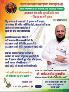 हमें विजयी बनाएं, आपका एक-एक वोट कीमती है | दिल से आपका शुक्रिया बहुत-बहुत धन्यवाद।(मुझे वोट दें)नगर अध्यक्ष उम्मीदवार 2025 जावेद माजिद लुलानिया