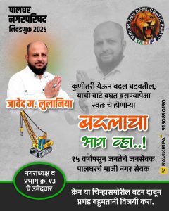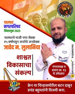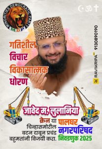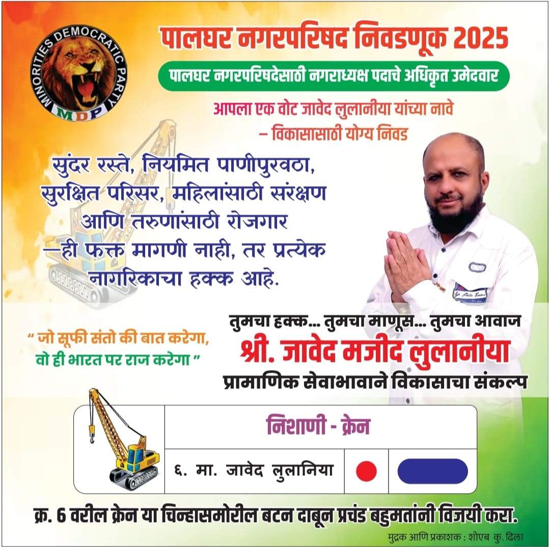 पार्टी : MDPनिशानी *क्रेन माइनॉरिटीज़ डेमोक्रेटिक पार्टीप्रत्याशी : जावेद माजिद लुलानिया,पालघर नगर अध्यक्ष 2025उम्मीदवार के लिए.