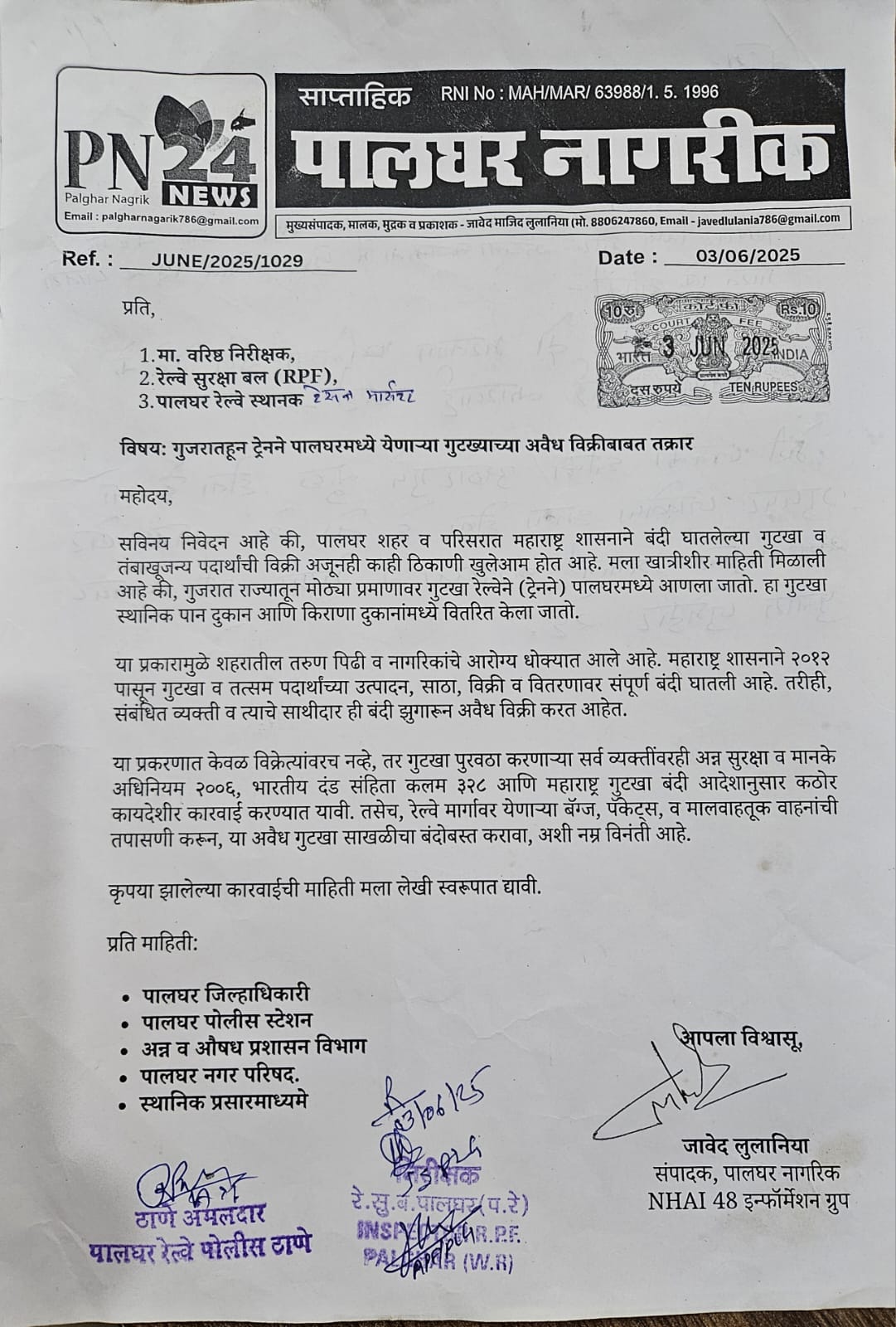 -पालघर, 14 अगस्त 2025 – पालघर रेलवे स्टेशन और गुजरने वाली ट्रेनों में अवैध गुटखा, पान मसाला, सिगरेट और शराब की बिक्री और सप्लाई लगातार जारी है।