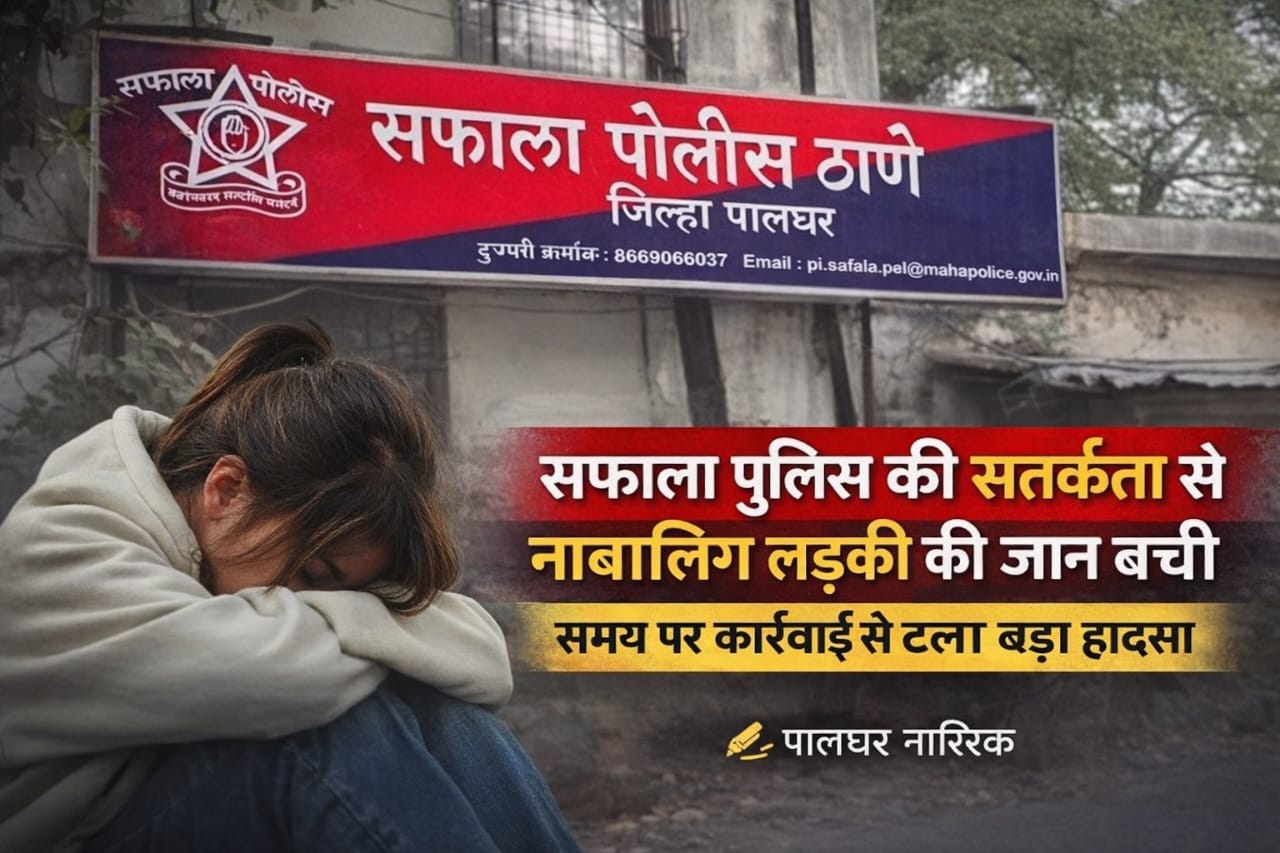 पालघर: सफाला पुलिस स्टेशन की हद में एक नाबालिग लड़की द्वारा आत्महत्या का प्रयास किए जाने की गंभीर घटना सामने आई, जिसे पुलिस की त्वरित और सतर्क कार्रवाई से टाल दिया गया। जानकारी के अनुसार, पारिवारिक कारणों और भावनात्मक तनाव के चलते उक्त लड़की घर से निकल गई थी और आत्मघाती कदम उठाने की स्थिति में थी।