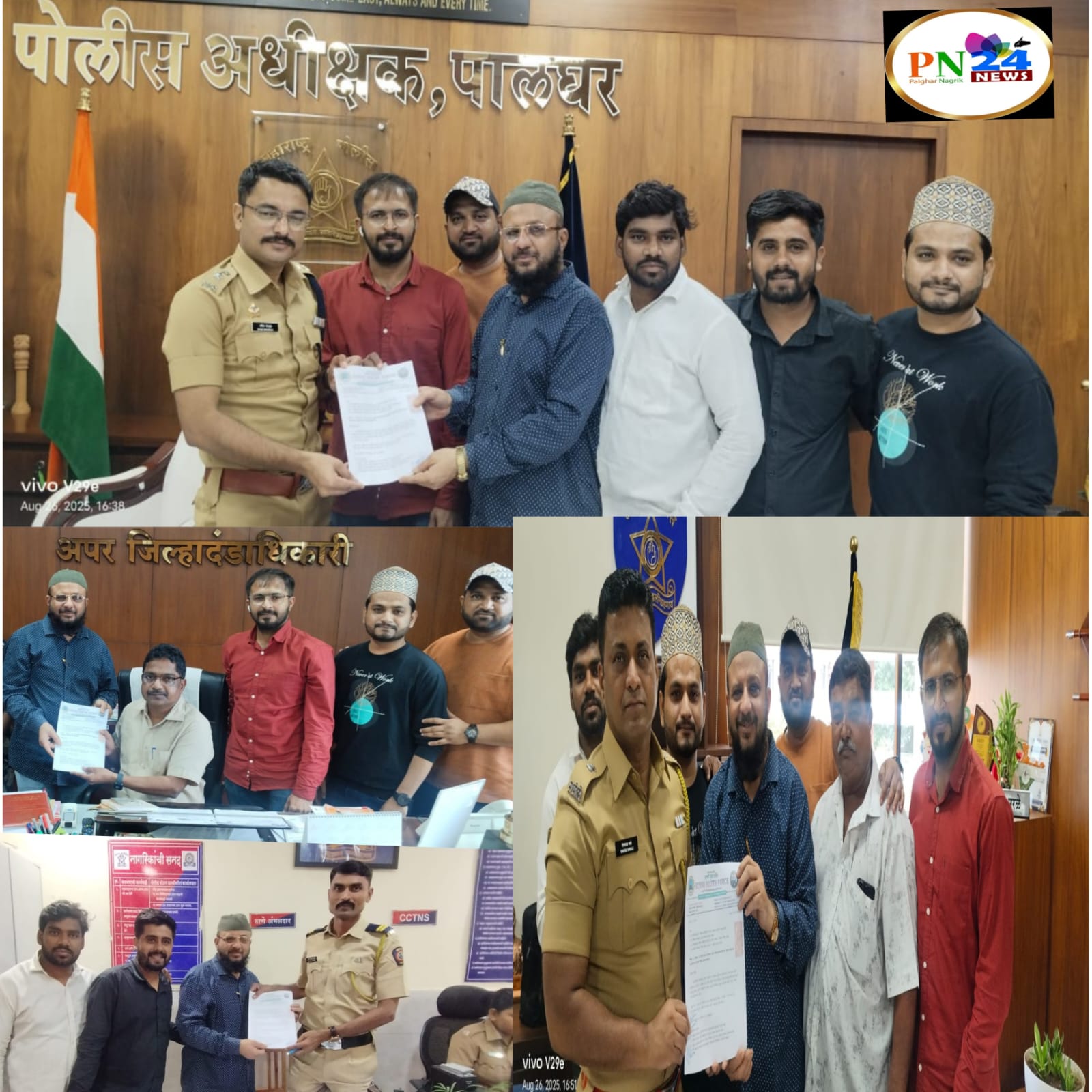 आज मायनॉरिटी डेमोक्रॅटिक पार्टी तर्फे पालघर जिल्ह्यात काढण्यात येणाऱ्या ईद-ए-मिलादुन्नबी (५ सप्टेंबर 2025) जुलूस संदर्भात अधिकृत परमिशन लेटर जिल्हा प्रशासनाला सुपूर्द करण्यात आले.
