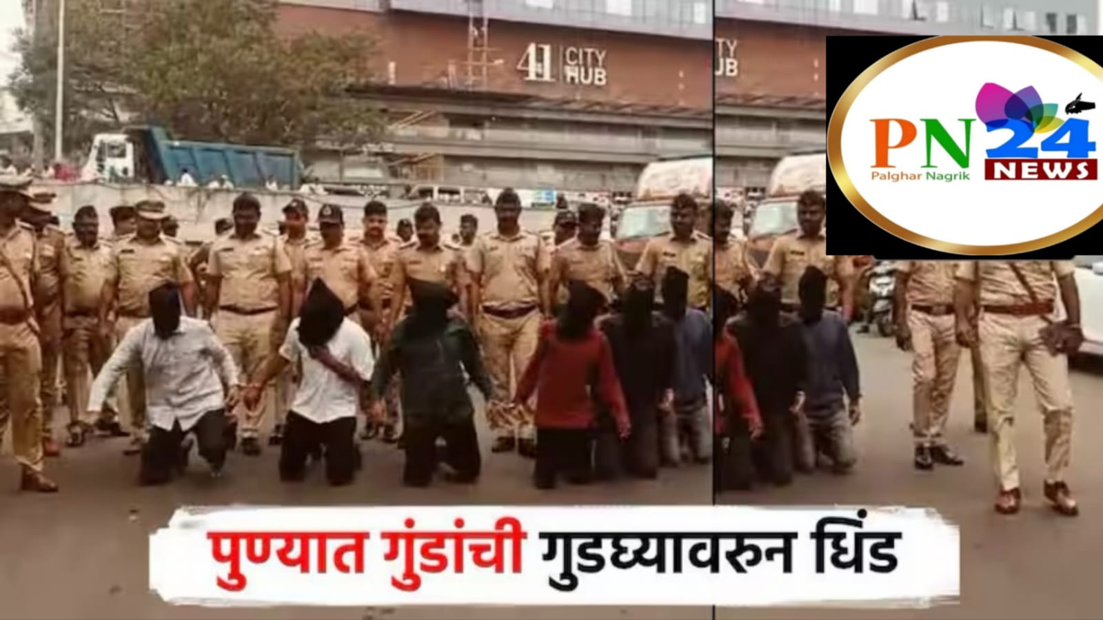 पुणे: पुण्य नगरी आणि शिक्षणाची पंढरी अशी ओळख असलेल्या पुणे (Pune) शहरात गेल्या काही वर्षात गुन्हेगारीच्या घटनांमध्ये मोठी वाढ झाल्याचं पाहायला मिळत आहे. माध्यमांमध्येही पुण्यातील गुन्हेगारीच्या (Crime news) घटना झळकत असतात. गेल्याच आठवड्यात पुण्यात भररस्त्यात आंदेकर गँगकडून आयुष कोमकर या युवकाचा खून करण्यात आल्याने खळबळ उडाली होती. या घटनेनं पुण्यातील गँगवार आणि टोळीयुद्ध चव्हाट्यावर आलं. तसेच, वेगवेगळ्या गँग, गोळीबार, वाहन तोडफोड, हल्ले यांसारख्या घटनांमध्ये वाढ झाल्याचं पाहायला मिळत आहे. त्याच पार्श्वभूमीवर पोलीसही (Police) अॅक्शन मोडवर आल्याचं दिसून येतय. पुण्यात सध्या घरफोडी, वाहन तोडफोडीच्या घटना घडत आहेत, अशाच एका घटनेतील आरोपींना पोलिसांनी अगदी नावाप्रमाणे “गुडघ्यावर” आणलं. गुडघ्यावरुन त्यांची धिंड काढण्यात आली होती.
