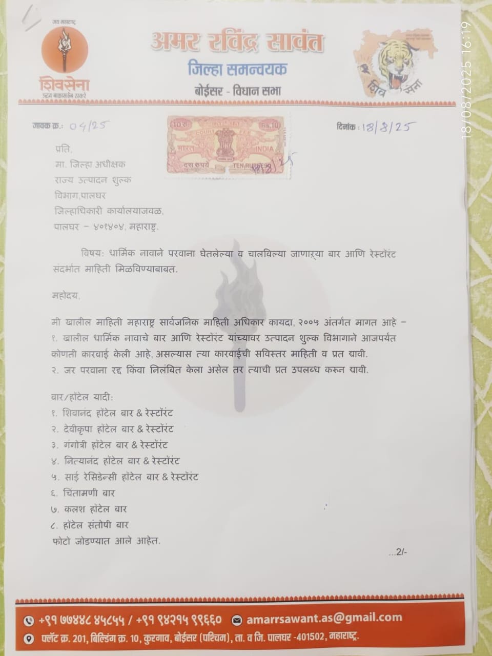 बोईसर विधानसभेतील शिवसेना उबाठा गटाचे (मशाल)चे जिल्हा समन्वयक अमर सावंत यांनी या धार्मिक नावाने चालणाऱ्या बार आणि रेस्टॉरंट्सविरुद्ध जिल्हा अधीक्षक, राज्य उत्पादन शुल्क विभाग, पालघर यांच्याकडे तक्रार दाखल केली आहे. तक्रारीत केवळ नावांचा उल्लेख नाही, तर प्रत्यक्ष छायाचित्रे आणि पुरावे जोडून कारवाईची मागणी करण्यात आली आहे. सावंत यांनी मांडलेला प्रश्न साधा आहे — “धार्मिक नावाने दारू विकणं ही केवळ श्रद्धेचा अपमान नाही का?” आणि याच प्रश्नाला उत्तर देणं हे आता प्रशासनाचं आणि शासनाचं नैतिक कर्तव्य आहे.